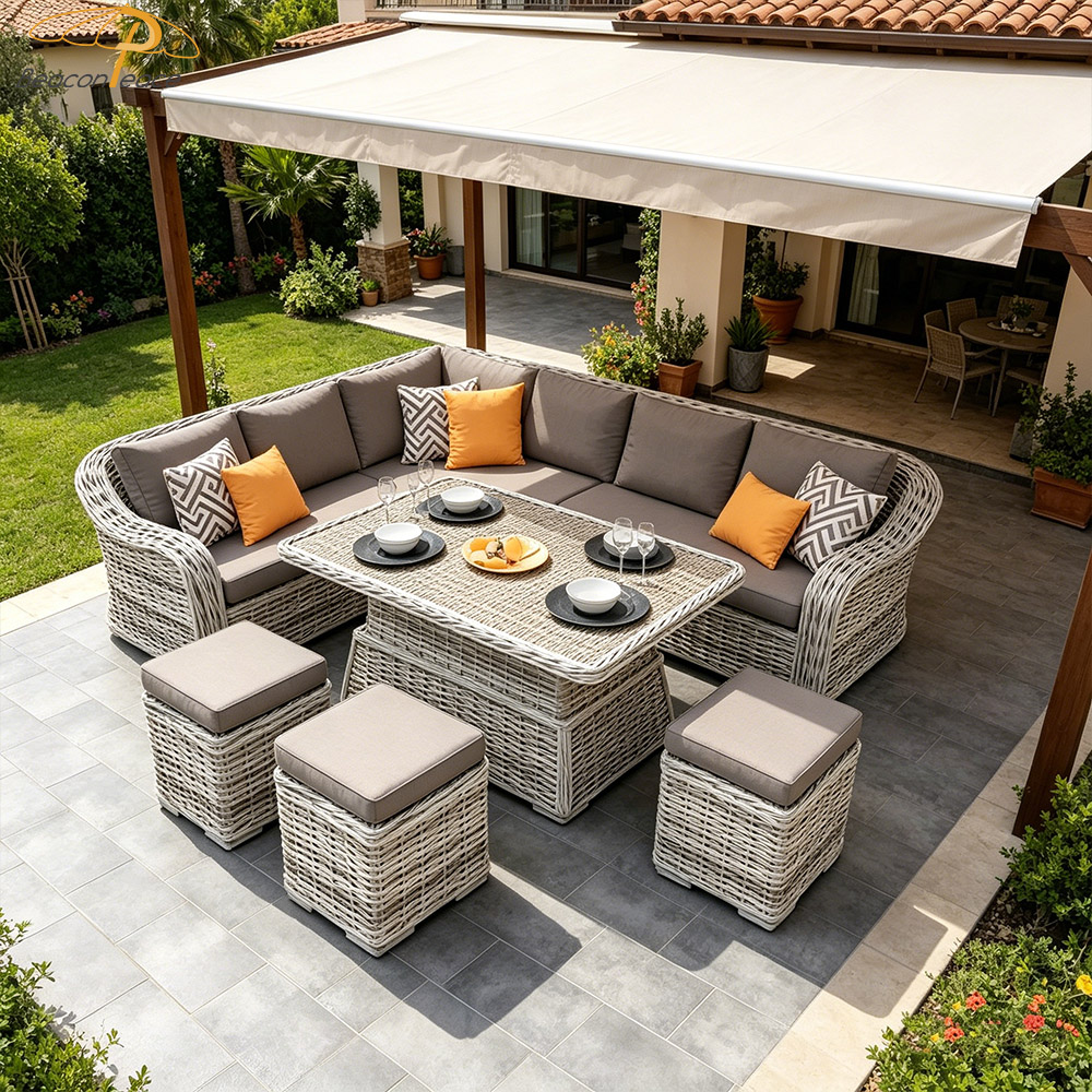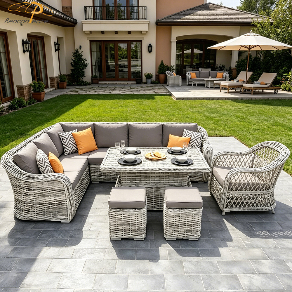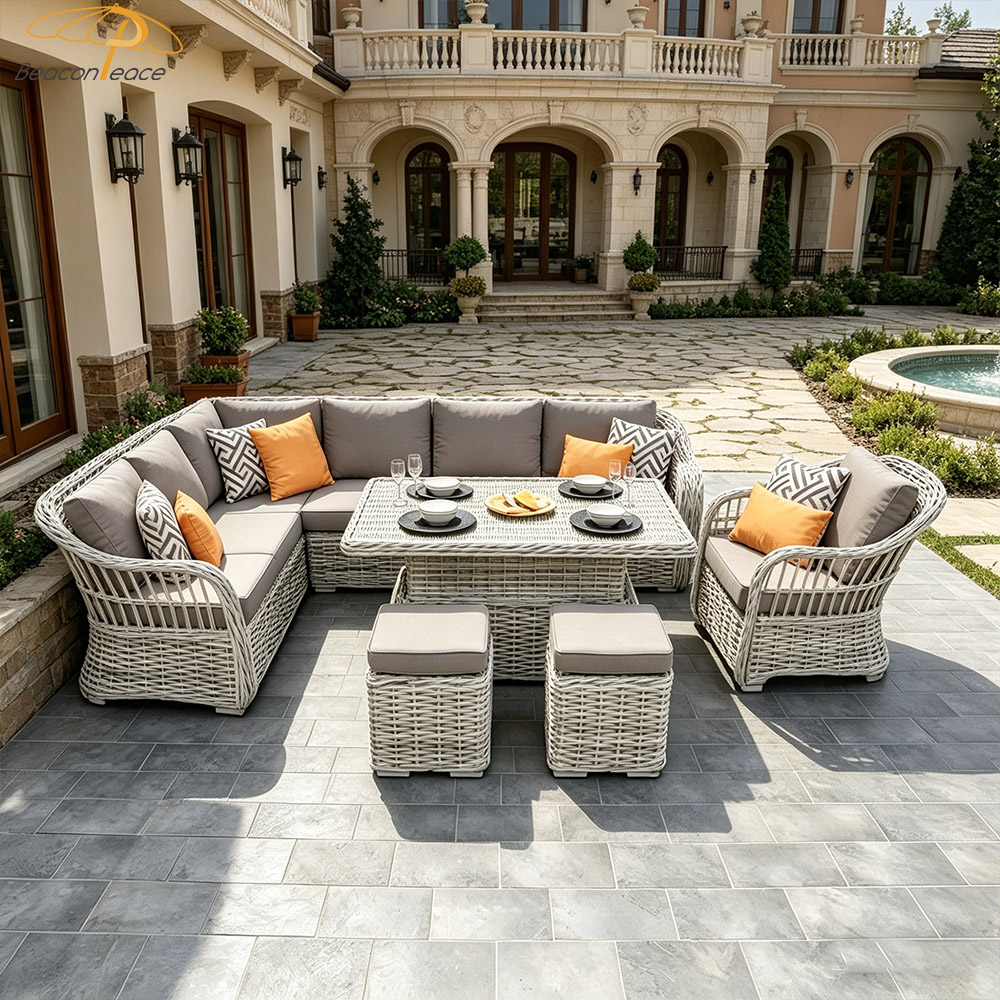 This handcrafted outdoor garden sofa set features high-resilience synthetic rattan, meticulously woven by hand, and is paired with comfortable, quick-drying, and waterproof cushions. Resistant to UV rays and aging, it stands impervious to the elements—come sun or rain. Its spacious, L-shaped modular design comfortably accommodates multiple people for relaxation and dining, while its versatile aesthetic complements a wide variety of outdoor settings. It creates a deeply soothing outdoor sanctuary, ensuring that every moment of your leisurely "slow time" is filled with pure comfort and tranquility.