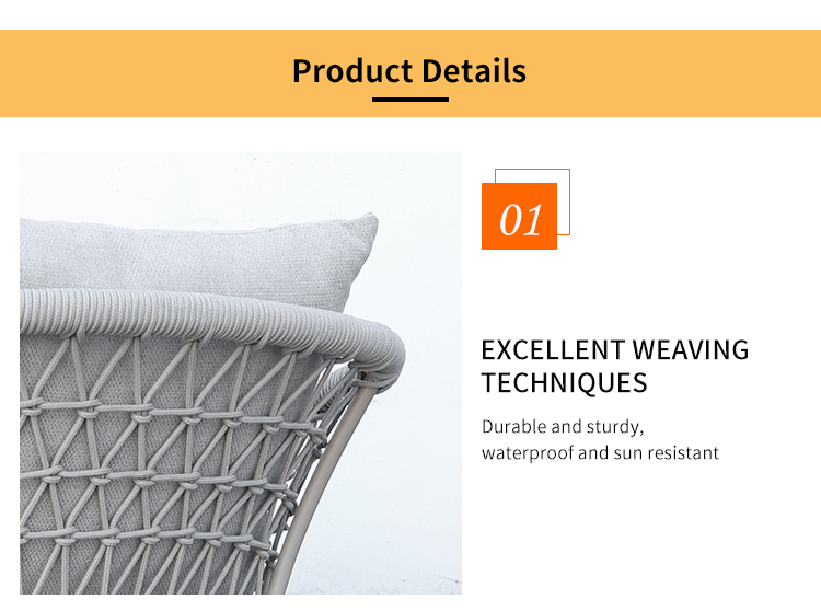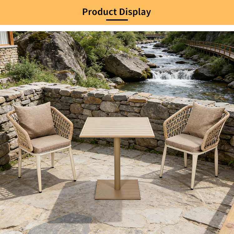 Table:aluminum frame with powder coated finish Chair:aluminum frame+outdoor rope weaving+waterproof cushionLead Time :