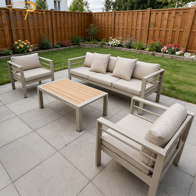 This BP8726 outdoor furniture set is crafted from a lightweight aluminum frame and durable wood-plastic table top. The aluminum frame offers rust resistance, sturdiness, and long-lasting durability, while the WPC tabletop mimics natural wood texture with excellent weather and water resistance. The thick, removable cushions provide exceptional comfort, making this set ideal for patios, gardens, or balconies, blending modern minimalist design with practical outdoor functionality.