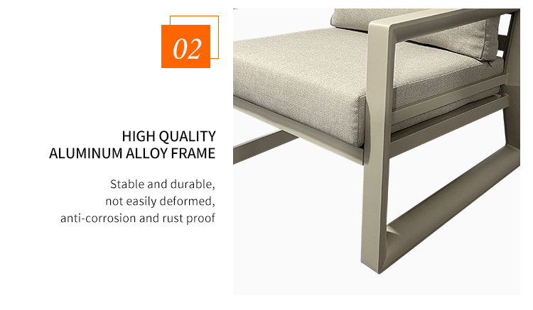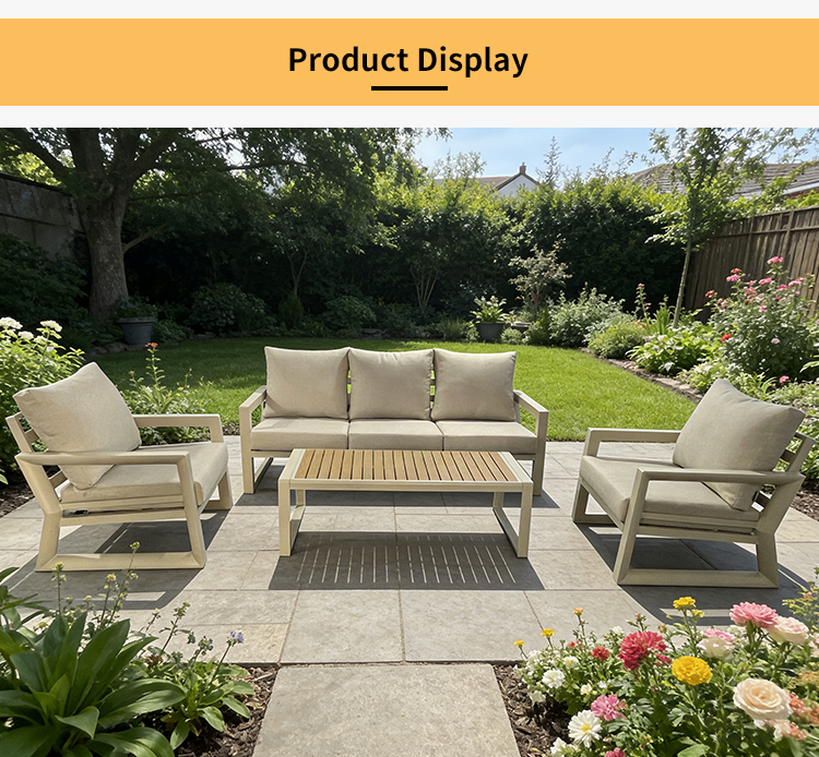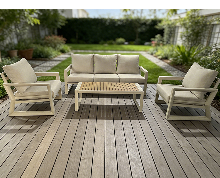 This BP8521 outdoor sofa set features a sturdy aluminum alloy frame that is corrosion-resistant, rust-proof, lightweight, and durable—standing up effortlessly to the rigors of outdoor sun and rain. The accompanying coffee table is topped with a high-quality poly-wood surface, offering a natural texture that is both wear-resistant and easy to clean. Complete with high-resilience, waterproof seat and back cushions, the set provides a plush, comfortable seating experience while remaining moisture-proof and weather-resistant. Easily adaptable to various outdoor settings—including courtyards, patios, and balconies—this set helps you create a durable yet comfortable outdoor leisure space that stands the test of time.