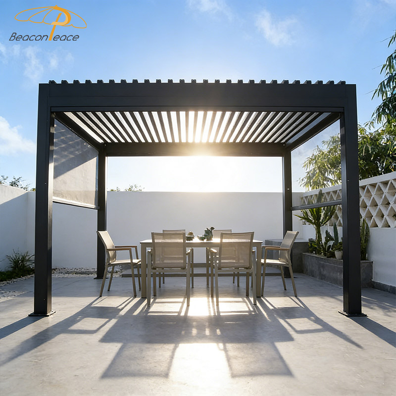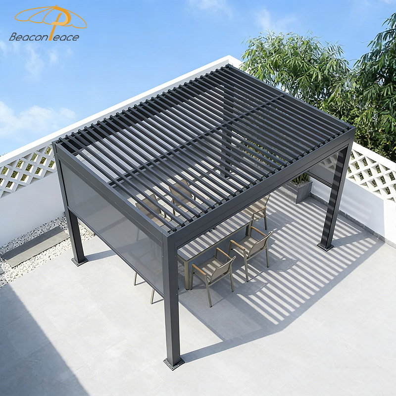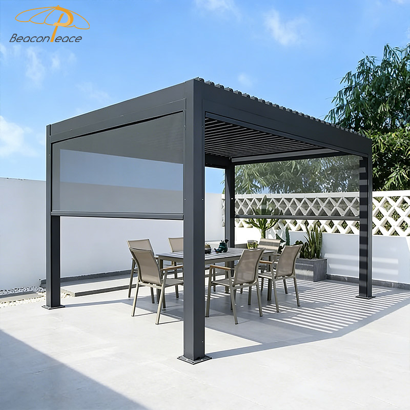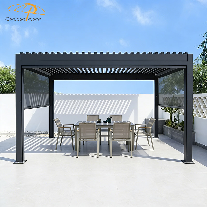 This BP8713 aluminum alloy louvered roof gazebo creates your ideal outdoor living space. With its superior wind and rain protection design, this gazebo provides reliable shelter in changeable weather. The flexible louvers allow for free circulation of sunlight and breezes, letting you fully enjoy the gifts of nature on warm days. Whether it's a gathering with friends or a moment of quiet contemplation, this is the perfect place to relax and enjoy life. Choose our gazebo and begin your leisurely moments!